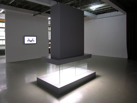 La dernière exposition de Mathieu Mercier se présente également comme un intérieur d’appartement susceptible d’être le lieu d’une enquête. Dispersés, les objets – une chaise, une télévision, un rideau, une lampe – confèrent à l’espace une dimension théâtrale. Au fond, un lourd rideau de velours obstrue l’espace alors que seules les œuvres produisent la lumière nécessaire à l’exposition. Un écran plat, une vitrine et une lampe – plafonnier produisent de conserve une lumière blanche et froide à la façon d’une cuisine ou d’un laboratoire. A l’image de ce halo, les objets ont une identité oscillante et s’avèrent autant familiers que doucement étranges. La télévision présente une tâche indéfinissable. Au centre, un volume balance doucement entre la vitrine, la cheminée et le monument. Proche de la chaise de jardin, un fauteuil s’en distingue pourtant par ses ouvertures particulières dans le dossier et les accoudoirs. Mais à ce régime de la familiarité étrange se substitue rapidement un régime de représentation tout à fait différent. Un rideau au motif de grillage, un tube fluo standard augmenté d’un néon spiralé procèdent quant à eux d’une juxtaposition évidente. Se trouvent alors dos-à-dos l’ornement et le fonctionnel, le standard et le particulier. Ces objets produisent avec efficacité des juxtapositions comme autant d’oppositions idéologiques identifiées : le monde bourgeois et la protection urbaine, l’industrie et l’artisanat… Ces œuvres ont alors l’immédiateté et la faiblesse des systèmes binaires. On peut convoquer la série magnifique des portraits de Lénine dans le style de Pollock réalisée par Art and Language entre 1979 et 1980. Ils se sont très clairement expliqués sur le principe binaire de cette série. « Dans les Portraits de V.I. Lenin in the style of Jackson Pollock, les conditions qui ont produit l’orthodoxie du réalisme socialiste et l’orthodoxie du modernisme américain sont conjoncturellement signifiantes. » L’opposition vise à identifier les forces dominantes qui caractérisent un moment, la Guerre Froide. Se trouvent indexés les systèmes de valeurs qui régissent l’esprit d’une époque et ses idéologies.