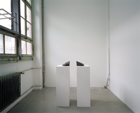 A côté de ces systèmes d’opposition, pour d’autres œuvres c’est la séparation qui semble déterminante. A l’écran, un fondu enchaîné des planches du test de Rorschach comme autant de formes symétriques. Hypnotique, ce film se régénère de tâches en tâches par son centre. Dans un espace adjacent, la seule œuvre qui en a l’air est un tas de terre pétri dont la coupe centrale est prolongée par deux socles distincts. Enfin, dans un coin, deux formes élémentaires associées dont la soudure en font un fémur en métal lourd. Or, les éléments sont bien familiers : une boule de pétanque et une barre de fer, deux instruments bien distincts qui associés pourraient augmenter leur force de frappe de manière considérable. Dans l’union de ces cultures opposées il y a le temps historique entre l’os-arme de poing et la fusion du métal appliquée à l’industrie militaire. La confrontation n’a ici plus rien à voir avec celle de Benjamin ou d’Art and Language. L’opération de Mathieu Mercier n’est pas une analyse de l’époque et encore moins une déconstruction des discours dominants. Ainsi le « fémur – barre de fer » est surtout le prélèvement singulier dans l’opération de mutation d’un objet identifié en un autre. Il est autant une soudure de deux objets qu’une ellipse cinématographique. Par le raccourci dans les événements, l’ellipse permet au film réaliste de se soustraire au temps réel. Elle serait donc ici un os jeté dans l’espace par un primate devenant ainsi un objet technologique. Sonnant tel un brevet d’une polysémie, le titre de l’exposition, A.N.X. serait la contraction universelle valable pour diverses langues : anxiety, Angst… L’exposition se présente bien sous le sceau de la polysémie et de la paranoïa. Elle articulerait donc le soupçon d’une signification dissimulée, d’un regard projectif, d’une démonstration… Elle se concentrerait dans les sédiments de la soudure, ces moments habituellement dissimulés dans l’ellipse.