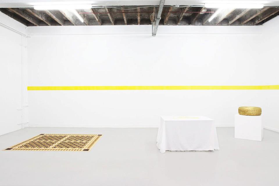 Tapis de Houmous et Epices: Laurent Mareschal; Peinture murale en Sucre Glace: Philippe Decrauzat; Débris de verre en sucre comestible sur la table : Pierre Vadi; Pneu en Chocolat: Sylvie Fleury